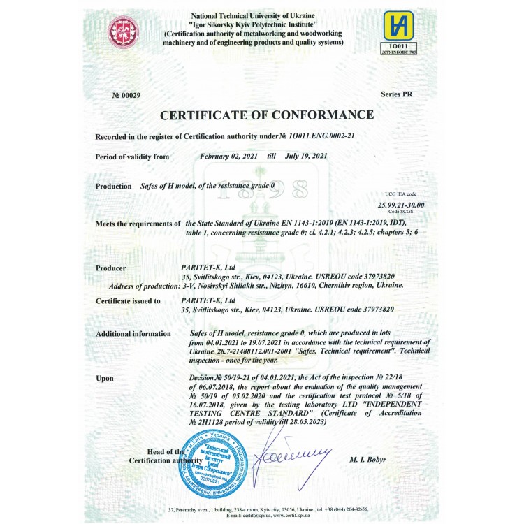 Украинский производитель ПАРИТЕТ-К является одним из лучших и самых прогрессивных в сфере проектирования и изготовления сейфов любой категории. Данная модель GRIFFON H.100.ET из серии H относится к взломоустойчивым. Она сертифицирована в Институте Точной Механики (IMP) по 1 классу сопротивления к взлому по стандарту EN 1143-1. Для надежности крепления предусмотрены отверстия для анкерных болтов. Это позволит закрепить сейф к полу или стене. Довольно большие габариты потребуют немало места в помещении. Это нужно учитывать