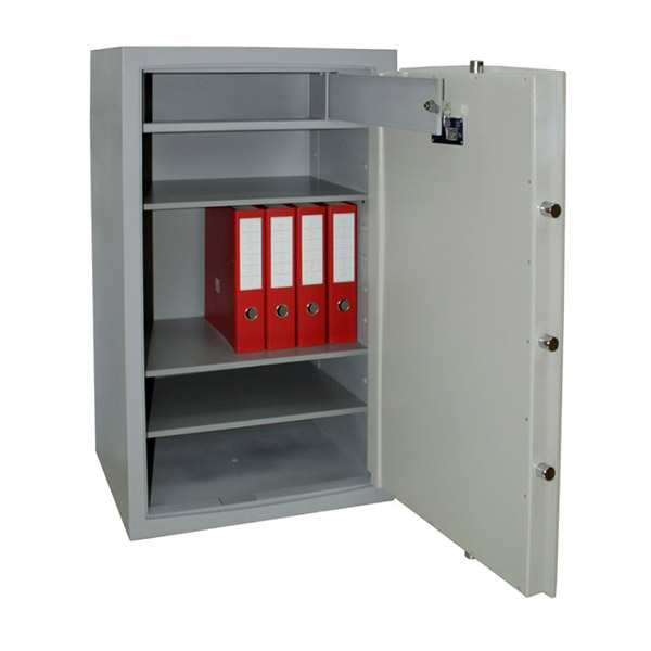 Внутреннее пространство имеет размеры: 949 мм по высоте, 550 мм по ширине и 418 мм по глубине. Есть 3 полки, которые позволят разделить, например, документы и деньги. Их можно легко снять, если будет необходимость хранить объемные предметы. Пространство внутри сейфа позволяет легко поместить обычные папки с документами формата А4 в 4 ряда. Дополнительно в этой модели есть отдельный кассовый отдел (трейзер), который можно закрыть на ключ.