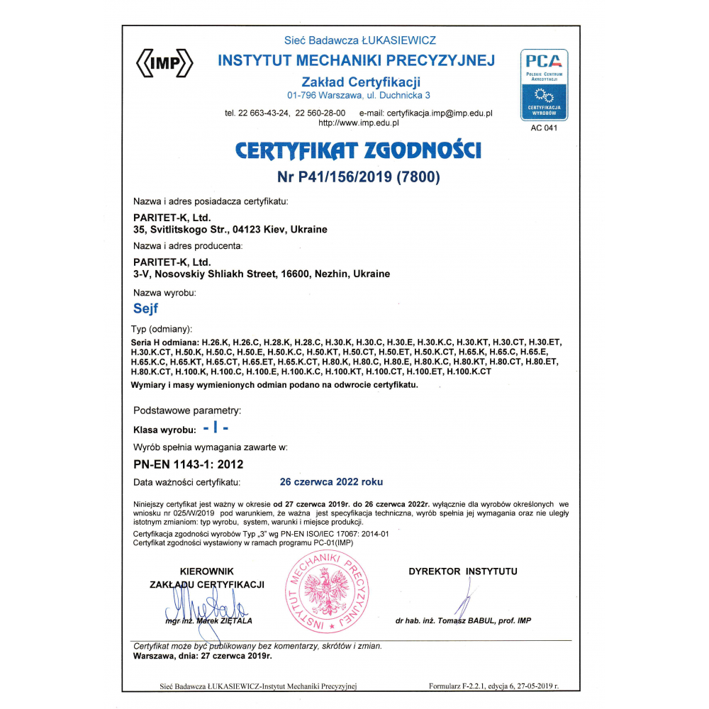 Украинский производитель ПАРИТЕТ-К является одним из лучших и самых прогрессивных в сфере проектирования и изготовления сейфов любой категории. Данная модель GRIFFON H.50.Е относится к взломоустойчивым. Она сертифицирована по I классу сопротивления к взлому по стандарту EN 1143-1. Для надежности крепления предусмотрены отверстия для анкерных болтов. Это позволит закрепить сейф к полу или стене.