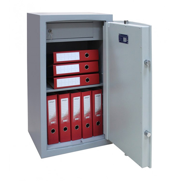 Внутреннее пространство имеет размеры: 811 мм по высоте, 441 мм по ширине и 328,5 мм по глубине. Есть 2 полки, которые позволят разделить, например, документы и деньги. Их можно легко снять, если будет необходимость хранить объемные предметы. Пространство внутри сейфа позволяет легко поместить обычные папки с документами формата А4 в 3 ряда. Дополнительно в этой модели есть отдельный кассовый отдел (трейзер), который можно закрыть на ключ.
