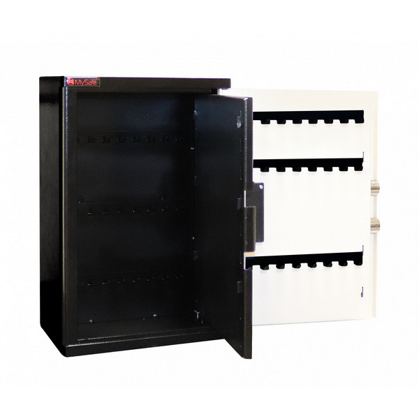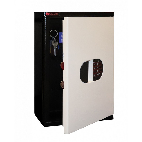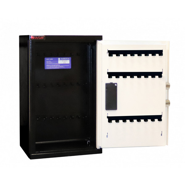 Корпус и двери сейфа изготовлены из металла толщиной 2 мм. Запирание осуществляется электронным кодовым замком MySafe. Он управляет 2-мя толстыми ригелями диаметром 25 мм. Они вращающиеся, что обеспечивает практическую защиту от возможности их перепиливания. В сочетании черного и кремово-белого цвета сейф отлично дополнит любое современное здание да не будет привлекать излишнее внимание.