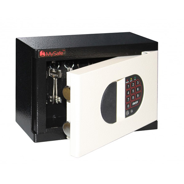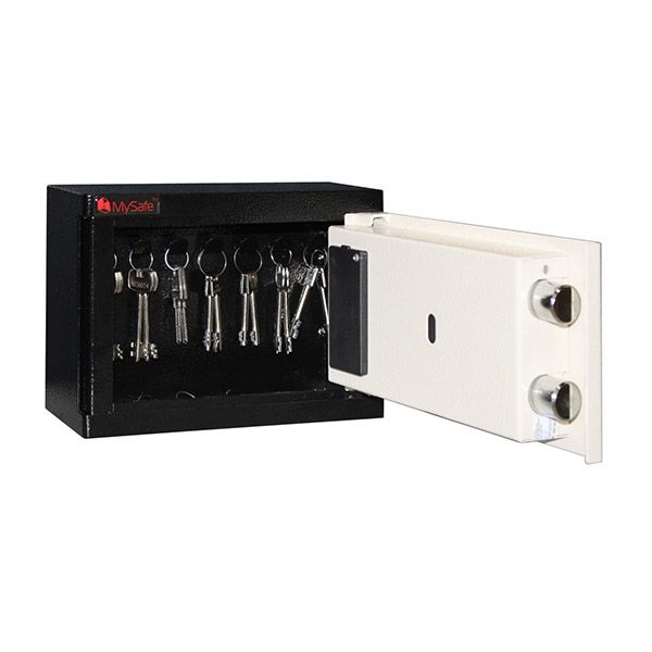 Корпус и двери сейфа изготовлены из металла толщиной 2 мм. Запирание осуществляется электронным кодовым замком MySafe. Он управляет 2-мя толстыми ригелями диаметром 25 мм. Они вращающиеся, что обеспечивает практическую защиту от возможности их перепиливания. В сочетании черного и кремово-белого цвета сейф отлично дополнит любое современное здание да не будет привлекать излишнее внимание.