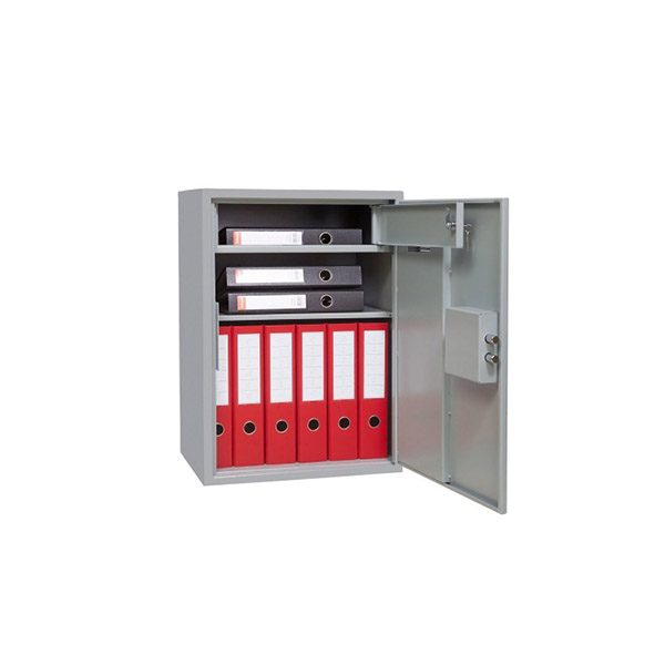 Внутреннее пространство имеет размеры: 624 мм по высоте, 458 мм по ширине и 327 мм по глубине. Внутри есть полка, которая позволят разделить, например, папки с файлами формата А4 в вертикальном виде и документы. Дополнительно в этой модели есть отдельный кассовый отдел (трейзер), который можно закрыть на ключ. Он отлично подойдет для хранения денег и других негабаритных ценностей.