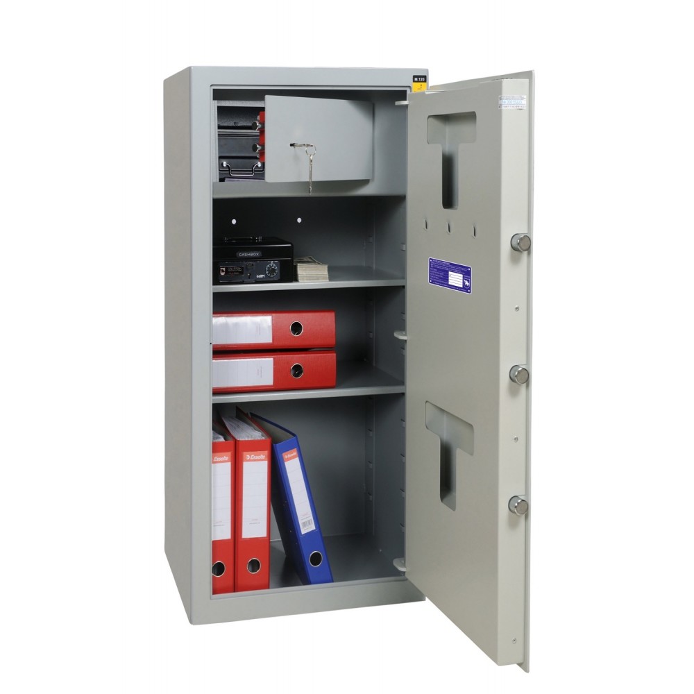 Внутреннее пространство имеет размеры: 1185 мм по высоте, 492 мм по ширине и 345 мм по глубине. Есть 2 полки с возможностью изменять высоту, которые позволят разделить его на три части. Их можно легко снять, если будет необходимость поместить объемные предметы. Мы же советуем использовать данную модель для хранения папок с документами формата А4 и папок-регистраторов. А для печатей и других важных ценностей предусмотрен кассовый отдел (трейзер). Он закрывается на ключ. Дополнительно на внутренней стороне дверцы присутствуют 2 дополнительных кармана, в которых можно удобно разместить небольшие документы и предметы (к примеру, паспорта). Также есть три крючка для хранения ключей.