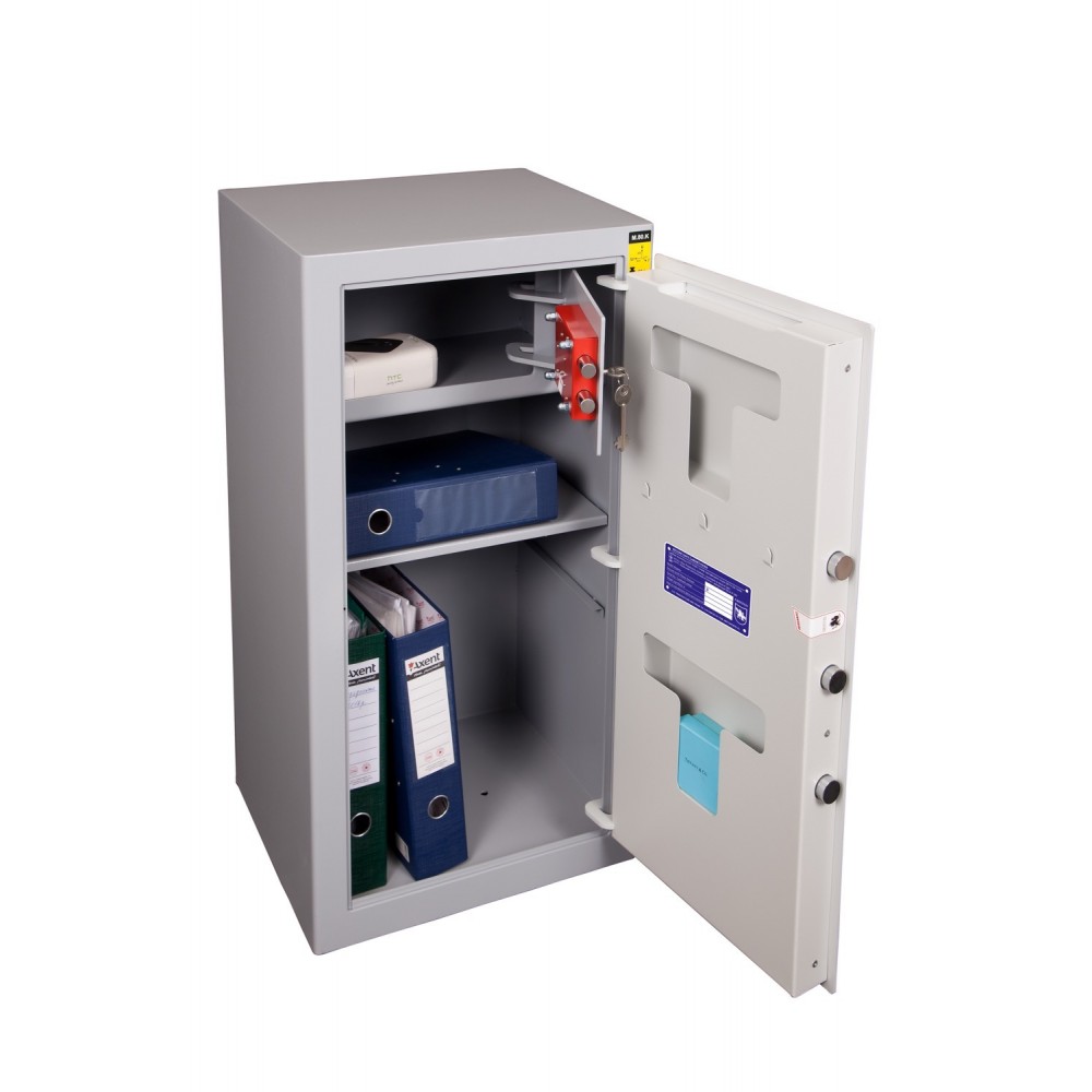 Корпус и двери сейфа изготовлены из металла толщиной 3 и 4 мм соответственно. Вместе с ключевым замком STUV это создаст существенную преграду для злоумышленника. Запирание осуществляется толстыми вращающимися ригелями диаметром 25 мм. Они обеспечат практическую защиту от возможности их перепиливания. Петли в форме антисрезов имеют внутреннее исполнение, поэтому их сбить совершенно невозможно. В сером цвете отлично дополнит любое современное помещение.