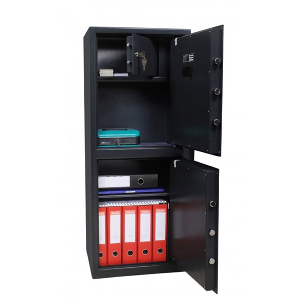 Внутреннее пространство имеет размеры: 2х575 мм по высоте, 474 мм по ширине и 335 мм по глубине. Главной особенностью этой модели является поделен внутренний объем на 2 независимых отдела. В нижнем есть полка, которая позволит разграничить папки с документами формата А4 в вертикальном виде с другими ценными вещами. В верхнем отделе присутствует касса (трейзер), которая отдельно закрывается на ключ и может использоваться для хранения денег или других ценностей.