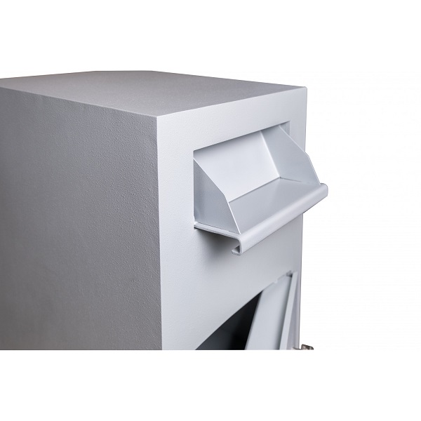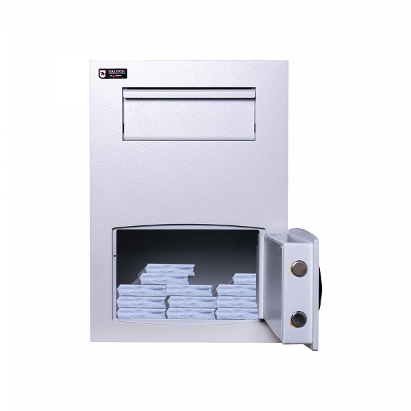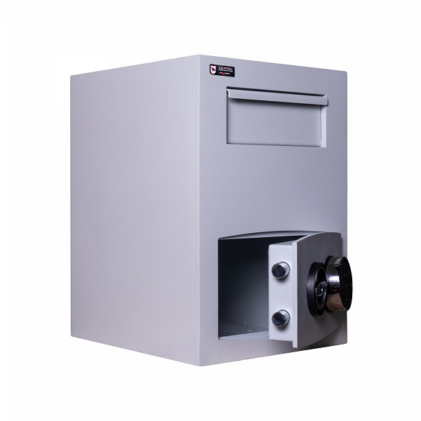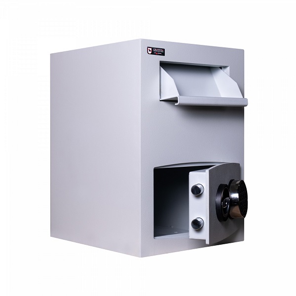 Наружные размеры составляют: 532 мм по высоте, 374 мм по ширине и 425 мм по глубине. Он состоит из одного большого отдела: сверху снаружи находится лоток для депонирования с местом для купюр. Он имеет специальную антифишинговую систему, которая не позволит злоумышленнику достать из-за него средства. Внизу – дверца, через которую происходит инкассация.
