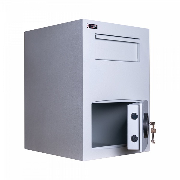 Наружные размеры составляют: 532мм по высоте, 374 мм по ширине и425мм по глубине. Он состоит из одного крупного отдела:сверху снаружи присутствует лоток для депонирования с местом купюр. Он имеет специальную антифишинговую систему, что не позволит злоумышленнику достать через него средства. Внизу – дверца, через которую происходит инкассация.