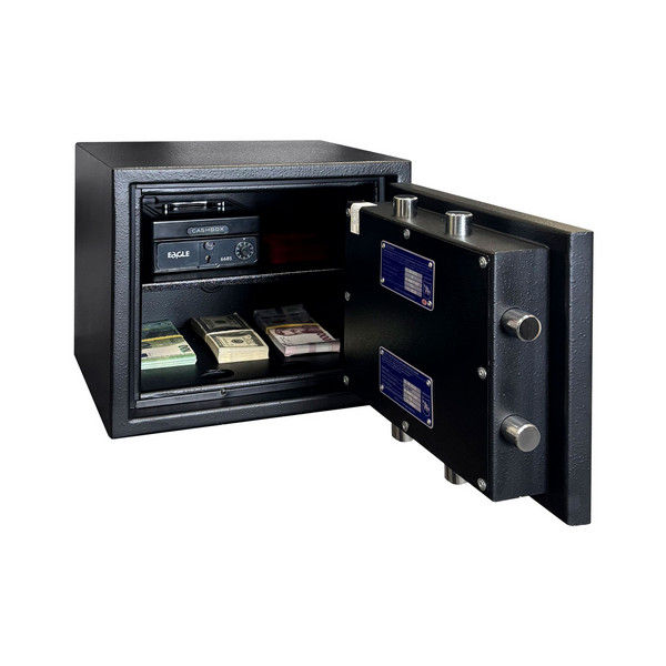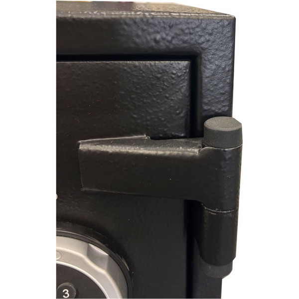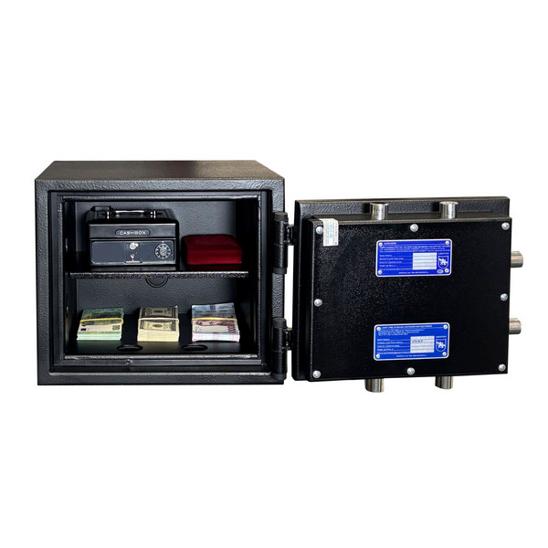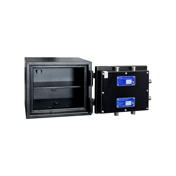 Сейф имеет трехстороннюю ригельную систему для замыкания, что гарантирует надежную защиту. Дополнительная защита осуществляется с помощью антисрезов со стороны петель. Шесть толстых вращающихся ригелей диаметром 25 мм обеспечивают практическую защиту от возможности их перепиливания. Имеет кодовый замок CARL WITTKOPP (Германия). С помощью отверстий под анкерные винты сейф можно легко установить и закрепить к полу. Все его особенности станут значимым барьером для любого потенциального злоумышленника.