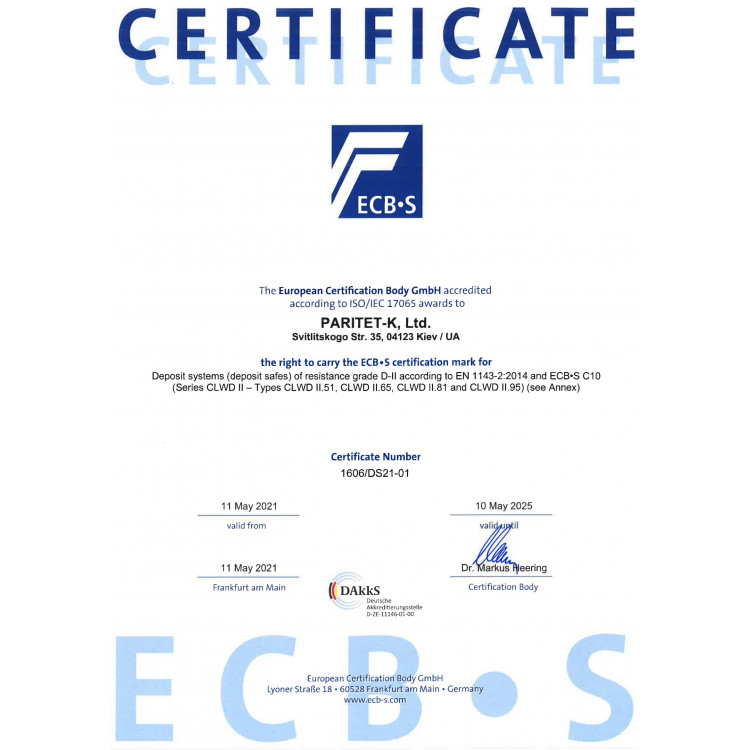Украинский производитель ПАРИТЕТ-К является одним из лучших и самых прогрессивных в сфере проектирования и изготовления сейфов любой категории. Данная модель GRIFFON CLWD II.81.K имеет отдел и отверстие для депонирования. Сертифицирована Европейским органом сертификации ECB-S по D-II классу сопротивления к взлому. Поэтому чаще всего используется в офисах, пунктах обмена валют, салонах красоты, автозаправочных станциях, магазинах, банках и тому подобное. Для надежности крепления предусмотрены отверстия для анкерных болтов. Это позволит закрепить сейф к полке/полу.