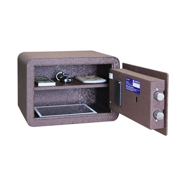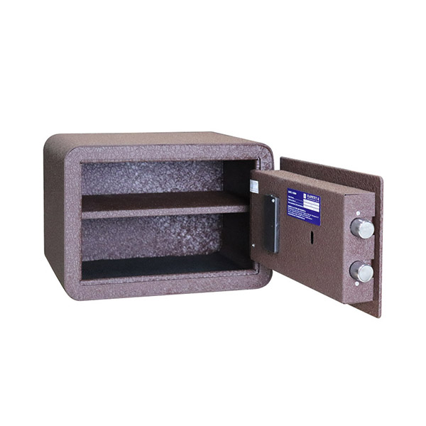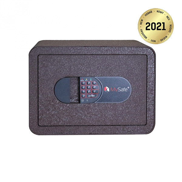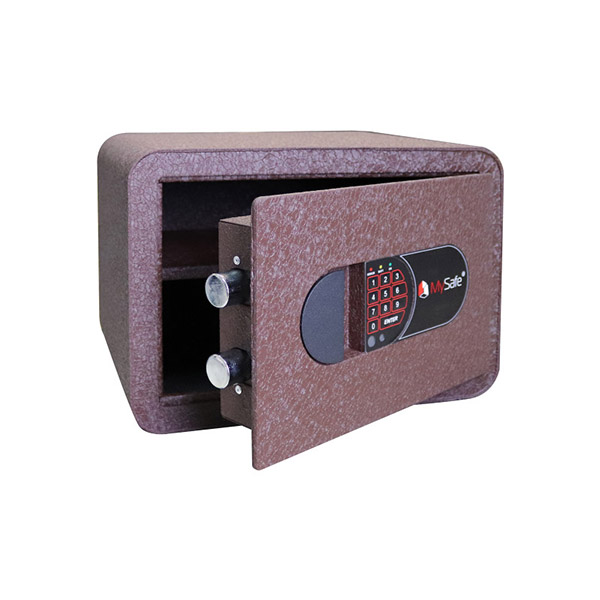 Корпус и двери сейфа изготовлены из металла толщиной 2 и 4 мм соответственно. Закрывается электронным кодовым замком MySafe. Запирание осуществляется толстыми вращающимися ригелями диаметром 25 мм. Они обеспечат практическую защиту от возможности их перепиливания. Петли в форме антисрезов имеют внутреннее исполнение, поэтому их сбить совершенно невозможно. В коричневом цвете отлично дополнит любое современное помещение.