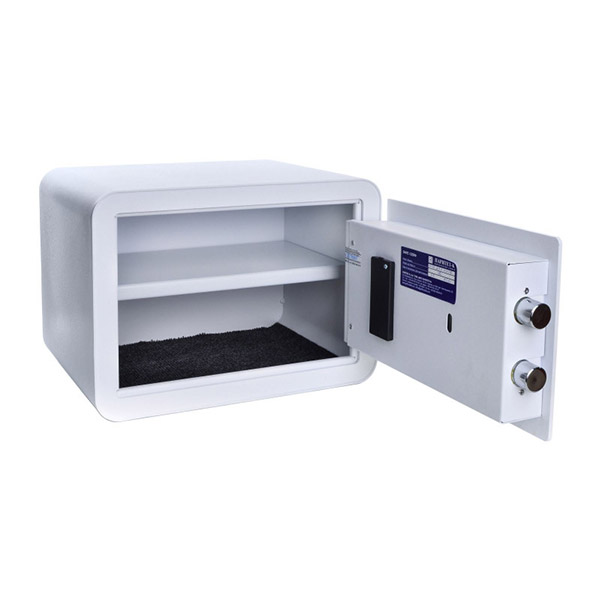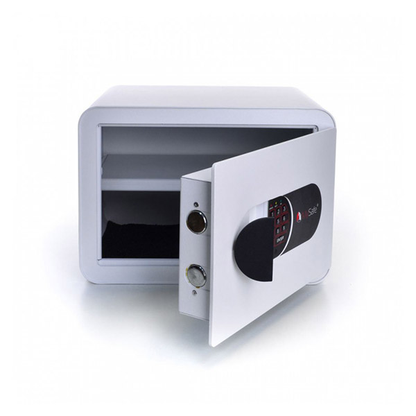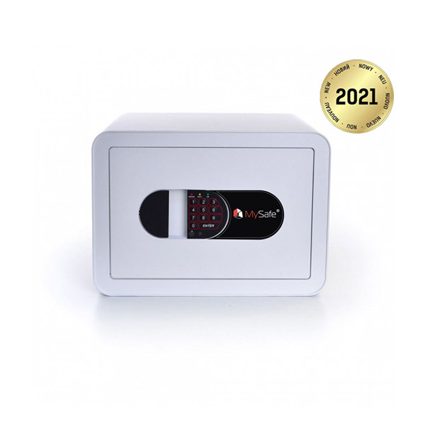 Корпус и двери сейфа изготовлены из металла толщиной 2 и 4 мм соответственно. Закрывается электронным кодовым замком MySafe. Запирание осуществляется толстыми вращающимися ригелями диаметром 25 мм. Они обеспечат практическую защиту от возможности их перепиливания. Петли в форме антисрезов имеют внутреннее исполнение, поэтому их сбить совершенно невозможно. В белом цвете отлично дополнит любое современное помещение.