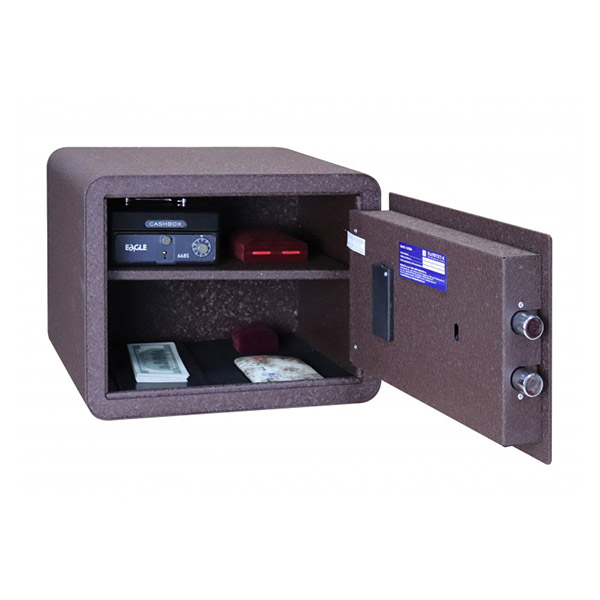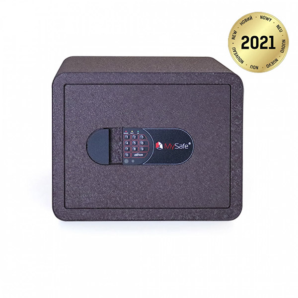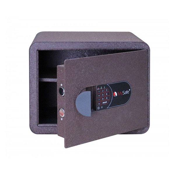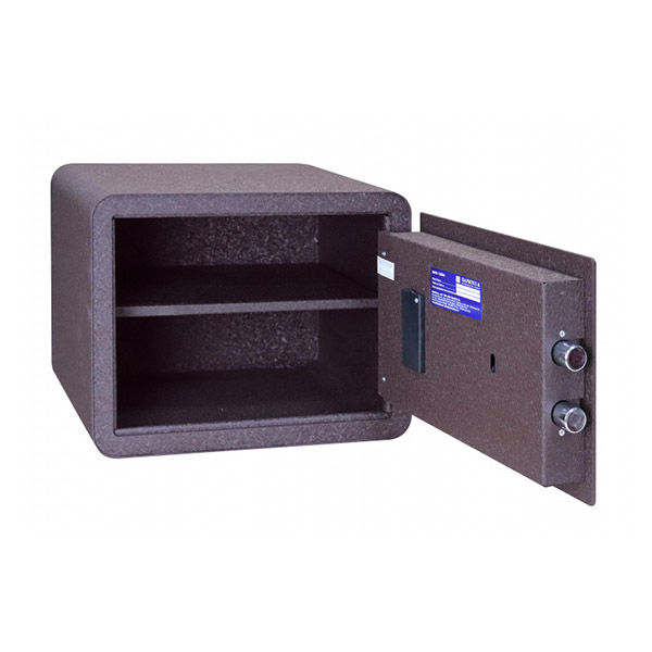 Корпус и двери сейфа изготовлены из металла толщиной 2 и 4 мм соответственно. Закрывается электронным кодовым замком MySafe. Запирание осуществляется толстыми вращающимися ригелями диаметром 25 мм. Они обеспечат практическую защиту от возможности их перепиливания. Петли в форме антисрезов имеют внутреннее исполнение, поэтому их сбить совершенно невозможно. В коричневом цвете отлично дополнит любое современное помещение.