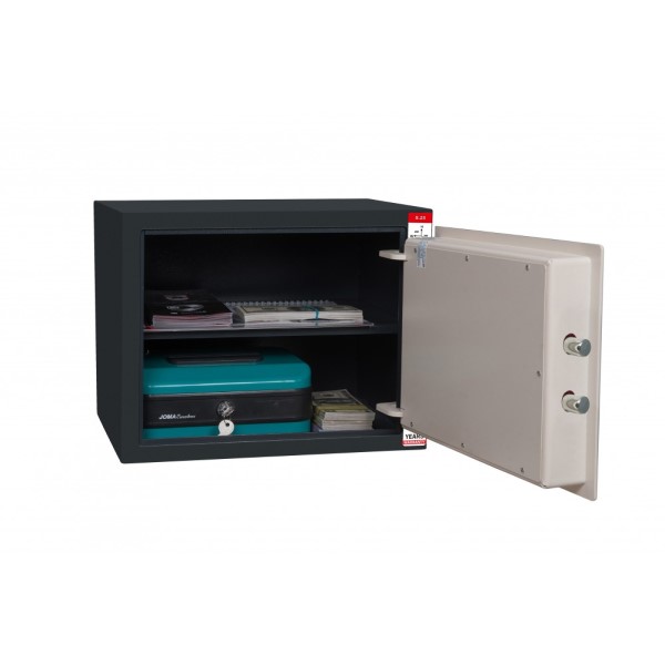 Корпус и двери сейфа изготовлены из металла толщиной 3 мм. Закрывается ключевым сувальдным замком. Запирание осуществляется вращающимися ригелями диаметром 16 мм. Они обеспечат практическую защиту от возможности их перепиливания. Петли имеют внутреннее исполнение. Они позволяют открыть двери сейфа на 90 градусов, не перекрывая при этом сам проем. В сочетании антрацитово-серого с кремово-белым цветом отлично дополнит любое современное помещение.