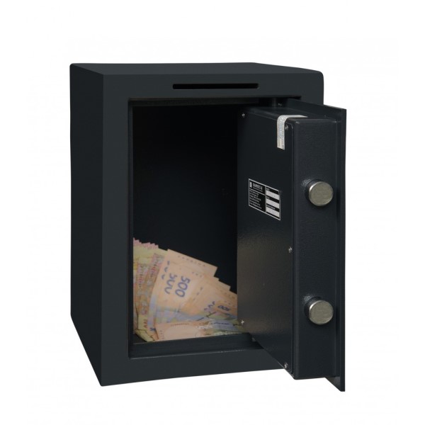 Корпус и двери сейфа изготовлены из металла толщиной 2 и 5 мм соответственно. Закрывается ключевым замком STUV. Запирание осуществляется толстыми вращающимися ригелями диаметром 25 мм. Они обеспечат практическую защиту от возможности их перепиливания. В антрацитово-сером цвете отлично дополнит любое современное помещение.