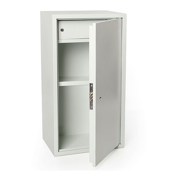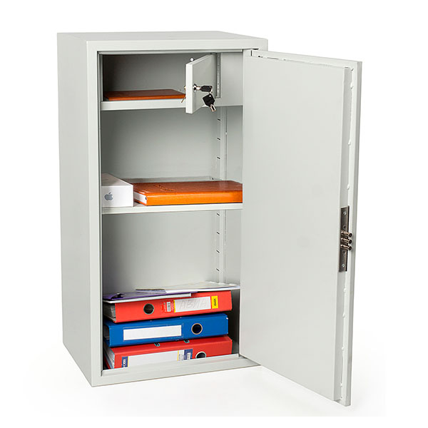 Корпус в виде сварной конструкции и двери сейфа изготовлены из стали. Их толщина составляет 1,2 мм. Сейф закрывается ключевым сувальдным замком, управляющим тремя ригелями. Для защиты от вандального взлома петли имеют внутреннее исполнение. В сером цвете он отлично дополнит современное помещение и не будет выделяться.
