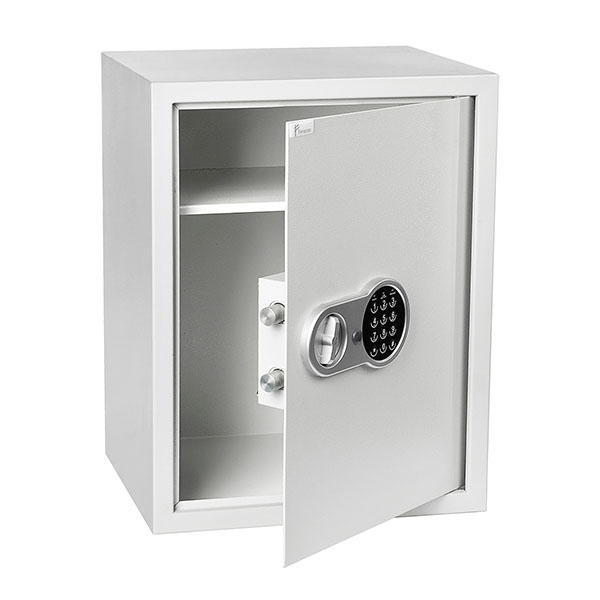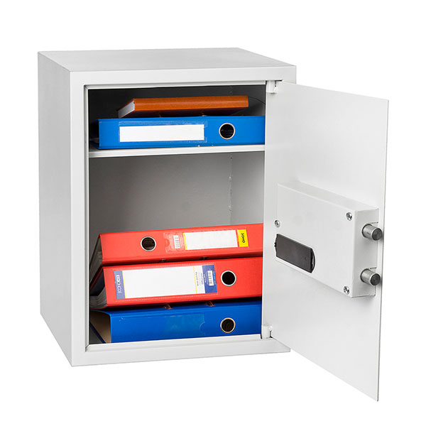 Корпус в виде сварной конструкции и двери сейфа изготовлены из стали. Их толщина составляет 1,2 мм и 2,5 мм соответственно. Сейф закрывается электронным кодовым замком, управляющим двумя ригелями. Для защиты от вандального взлома петли имеют внутреннее исполнение. В сером цвете он отлично дополнит современное помещение и не будет выделяться.