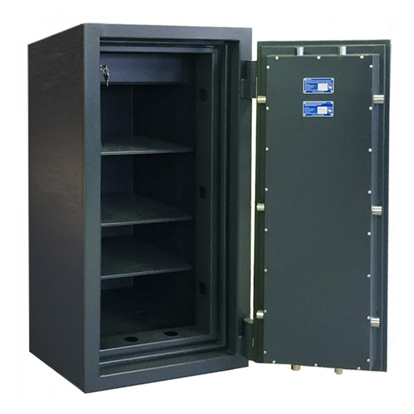 Стенки корпуса данного сейфа заполнены фортификационным бетоном толщиной 100 мм. Вместе с ключевым сейфовым замком STUV и электронным кодовым замком M-LOCKS это создаст существенную преграду для злоумышленника. Запирание осуществляется ригельной системой трехстороннего действия. Толстые вращающиеся ригеля диаметром 32 мм обеспечат практическую защиту от возможности их перепиливания. Дополнительно со стороны петель имеются антисрезы. Удобства пользования добавляет эргономичная ручка. В темно-сером цвете сейф отлично дополнит любое современное помещение.