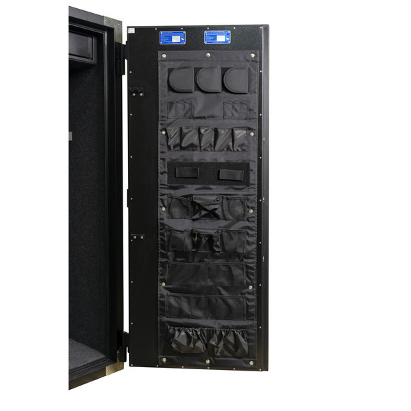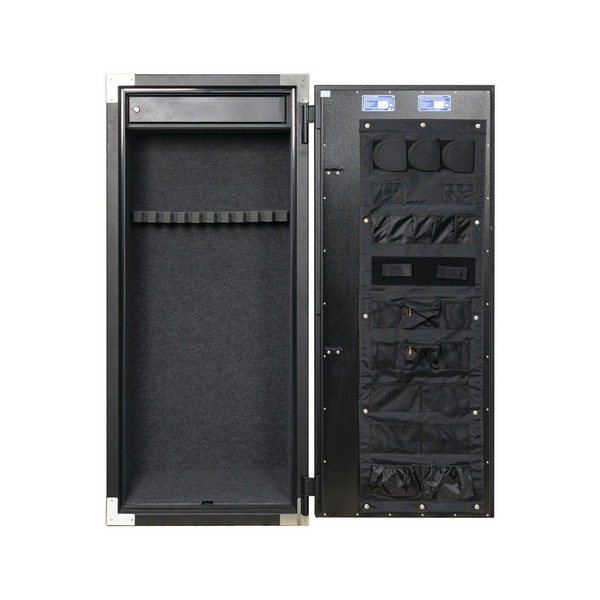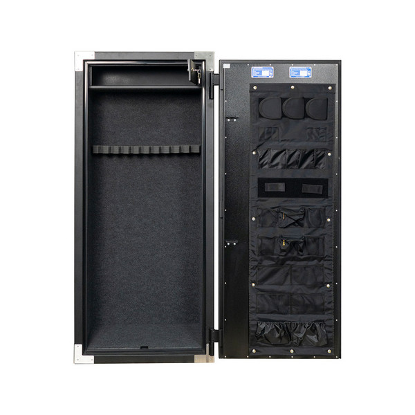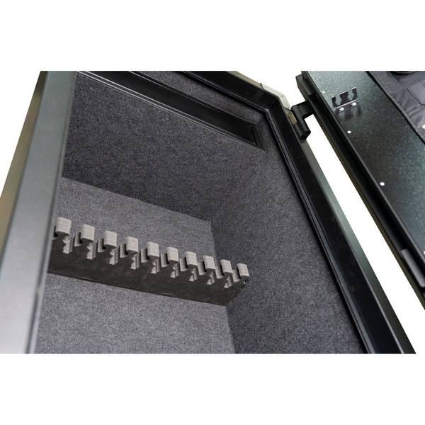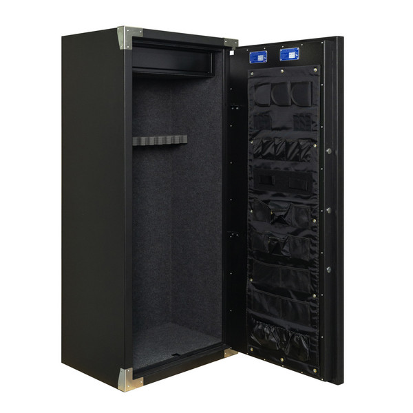 Внутреннее пространство имеет размеры: 1463 мм по высоте, 604 мм по ширине и 353 мм по глубине. Сейф оснащен специальными накладками из нержавеющей стали и укомплектован довольно вместительным органайзером для оружейных аксессуаров. Пространство внутри сейфа украшено темно-серым ковролином. Дополнительно у этой модели есть отдельный кассовый отдел (трейзер).