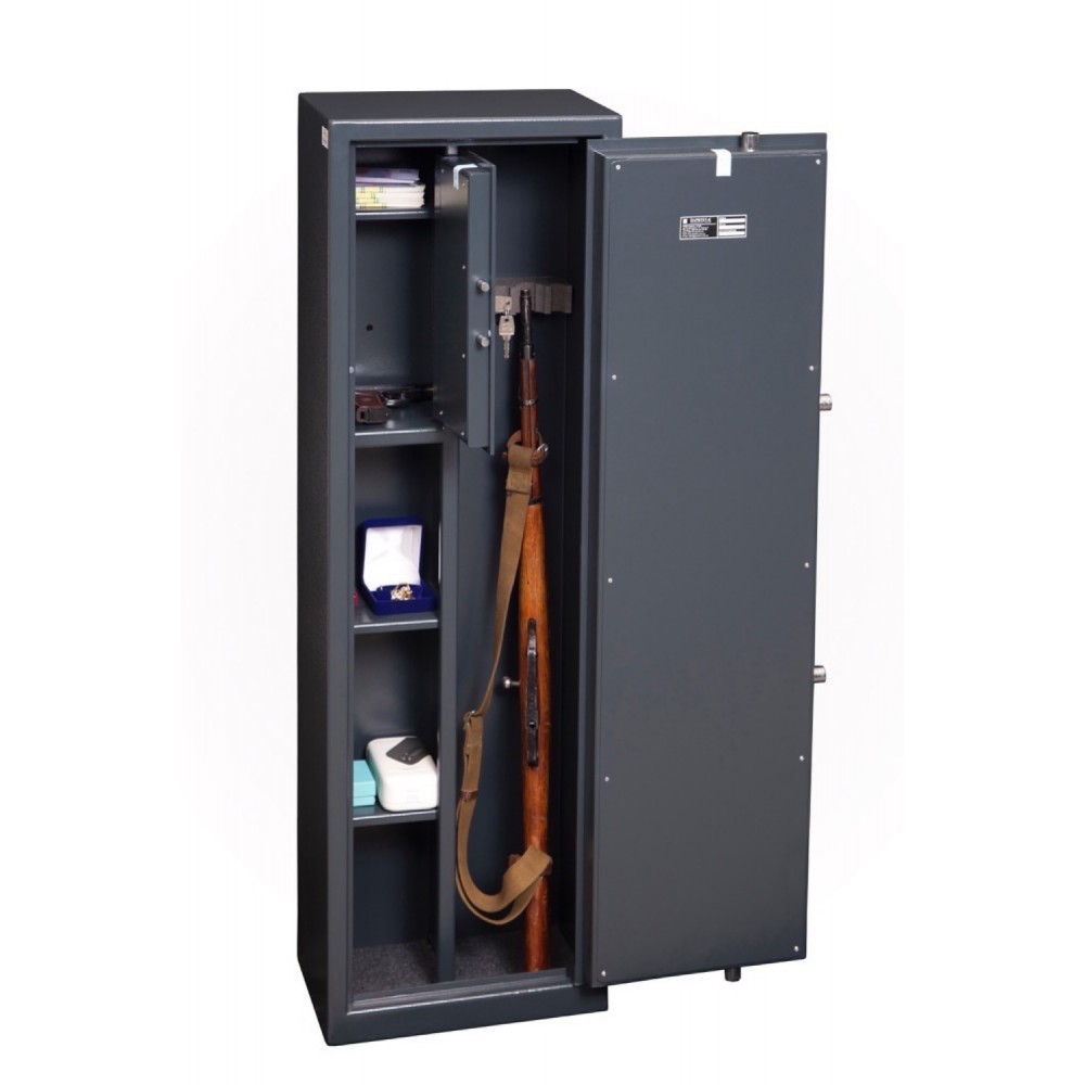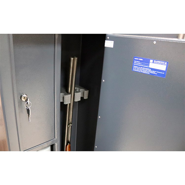 Внутреннее пространство имеет размеры: 1288 мм по высоте, 414 мм по ширине и 177 мм по глубине. Есть 2 полки, которые можно легко снять, если будет необходимость хранить объемные предметы. В основном отделе присутствует ложемент для 3-х ружей. Дополнительно сейф оборудован отдельным кассовым отделом (трейзером), который можно закрыть на ключ. Его используют для хранения патронов. Для удобства в нем тоже есть одна полка.