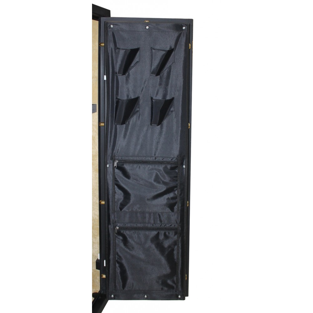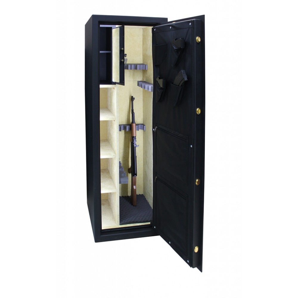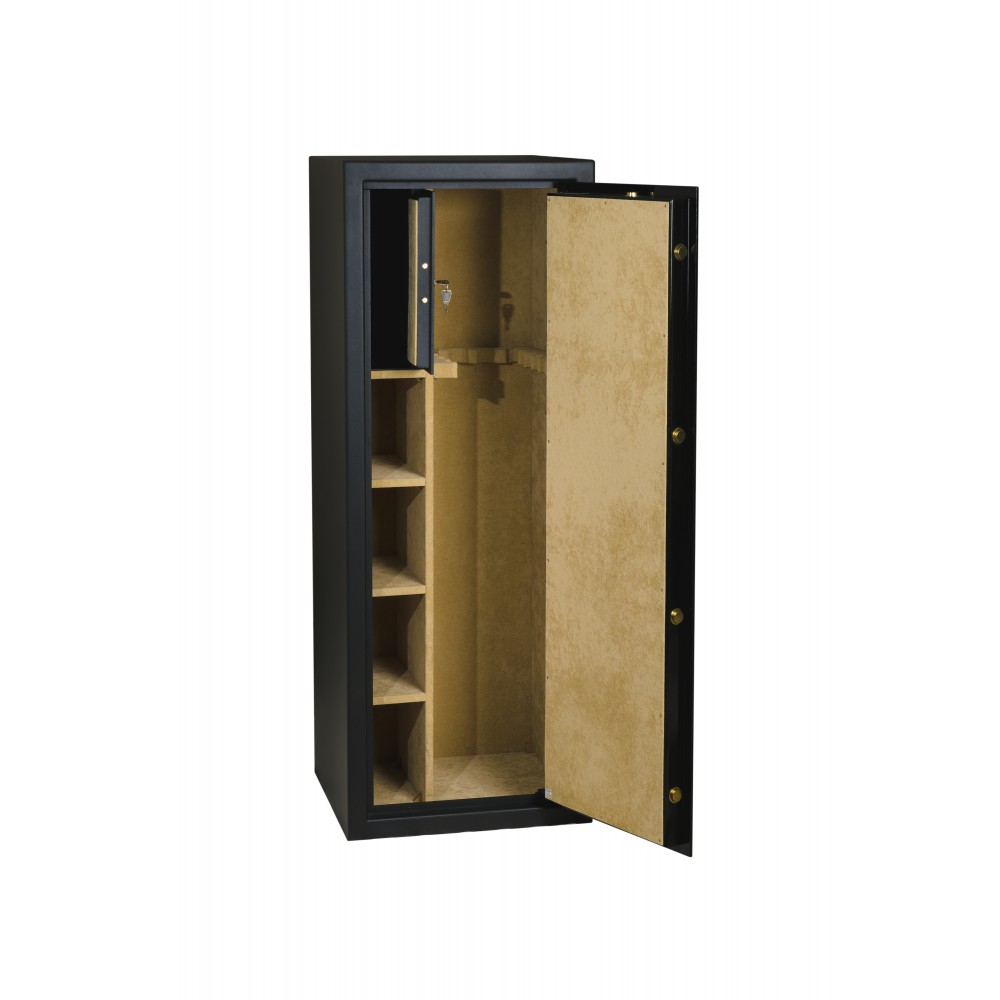 Внутреннее пространство имеет размеры: 1472 мм по высоте, 554 мм по ширине и 419 мм по глубине. Главной его фишкой является мягкий обивочный материал. Присутствуют 3 полки, которые можно легко снять, если будет необходимость хранить объемные предметы. В основном отделе комплектуется ложементом для 13-ти единиц оружия. Дополнительно сейф оборудован отдельным кассовым отделом (трейзером), который можно закрыть на ключ. Его используют для хранения патронов.