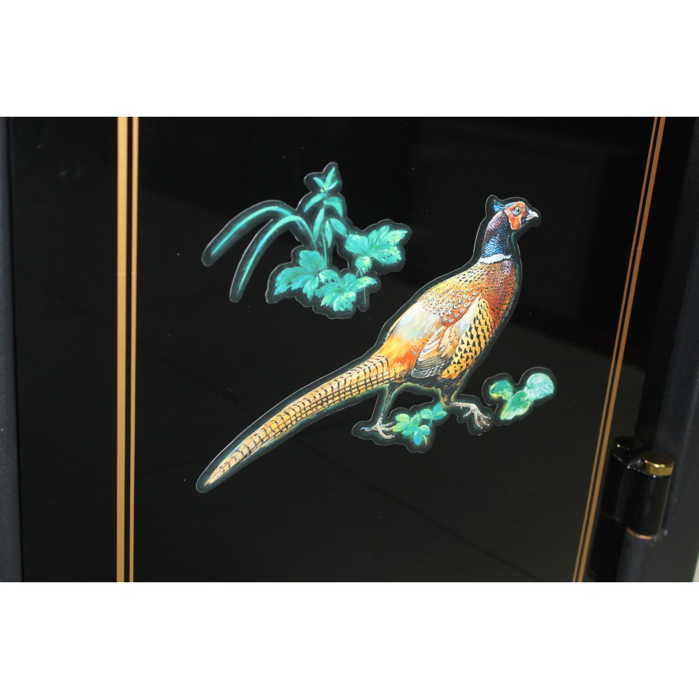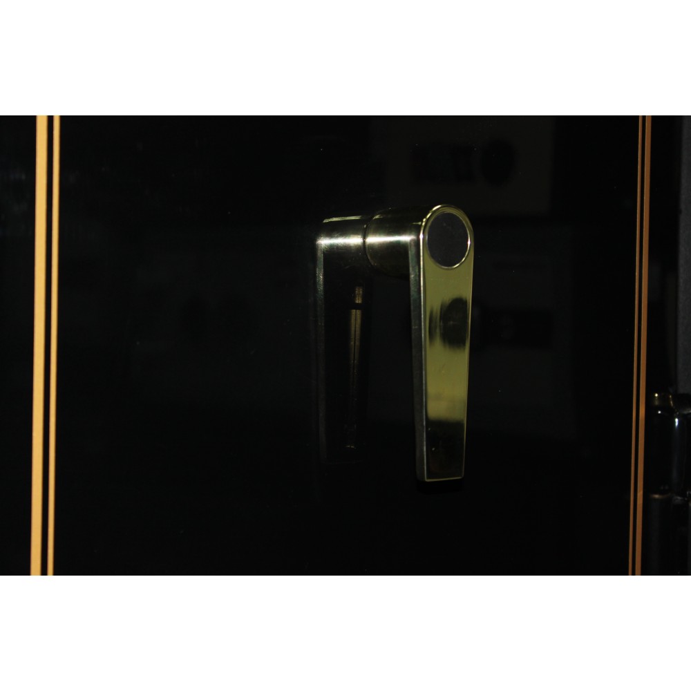 Корпус и двери сейфа изготовлены из металла толщиной 3 и 6 мм соответственно. Вместе с электронным кодовым замком LaGard это создаст существенную преграду для злоумышленников. Запирание осуществляется ригельной системой трехстороннего действия. Толстые вращающиеся ригеля диаметром 25 мм обеспечат практическую защиту от возможности их перепиливания. Дополнительно со стороны петель есть антисрезы. Внешне сейф выполнен в стильном черном цвете с интересным оформлением с позолоченными элементами. Это лишний раз покажет отличное чувство стиля его владельца.