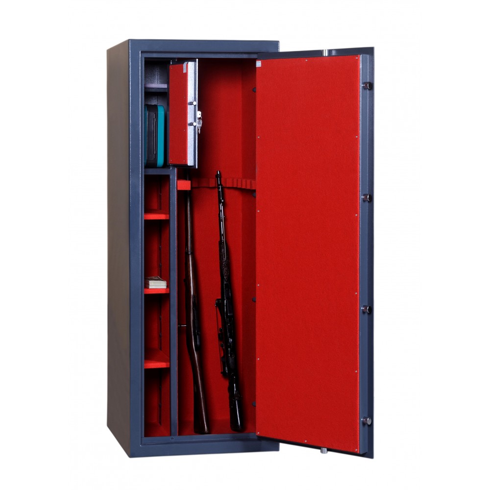 Внутреннее пространство имеет размеры: 1472 мм по высоте, 554 мм по ширине и 419 мм по глубине. Имеет красную внутреннюю отделку. Есть 3 полки, которые можно легко снять, если будет необходимость хранить объемные предметы. В основном отделе присутствует ложемент для 13-ти единиц оружия. Дополнительно сейф оборудован отдельным кассовым отделом (трейзером), который можно закрыть на ключ. Его используют для хранения патронов. Для удобства в нем тоже есть одна полка.