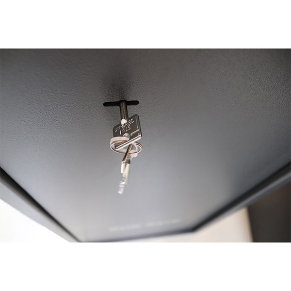 Корпус и двери сейфа изготовлены из металла толщиной 2 и 5 мм соответственно. Вместе с нижним ключевым сейфовым замком STUV и верхним электронным кодовым замком GRIFFON это создаст существенную преграду для злоумышленников. Запирание осуществляется ригельной системой. Толстые вращающиеся ригеля диаметром 25 мм обеспечат практическую защиту от возможности их перепиливание. В антрацитово-сером цвете сейф отлично дополнит любое современное здание и не будет выделяться.