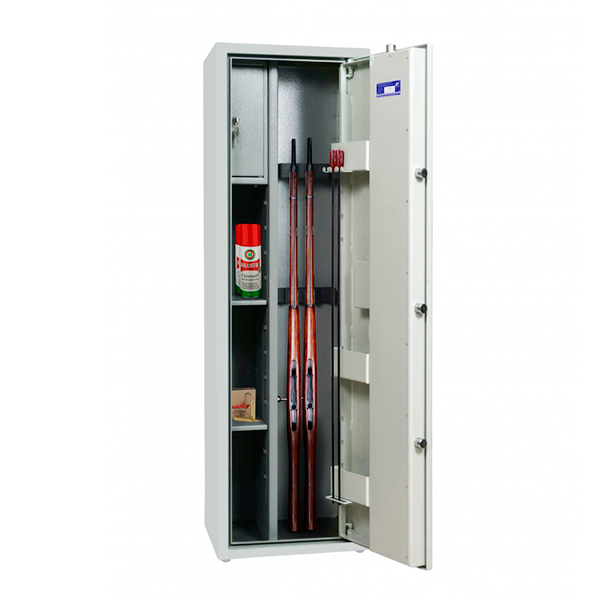 Внутреннее пространство имеет размеры: 1394 мм по высоте, 414 мм по ширине и 293 мм по глубине. Он включает передвижной ложемент под оружие с оптикой и съемный магнитный ложемент, который устанавливается на любую удобную высоту. Есть 3 полки. Их можно легко снять, если будет необходимость хранить объемные предметы. Кроме того, на дверях присутствуют съемные навесные элементы, которые переставляются: карманы для магазинов под патроны и средства по уходу за оружием, держатели для шомполов (2-4 ед.), крючки. Дополнительно в этой модели есть кассовый отдел (трейзер), который можно использовать для хранения патронов. Он закрывается на ключ.