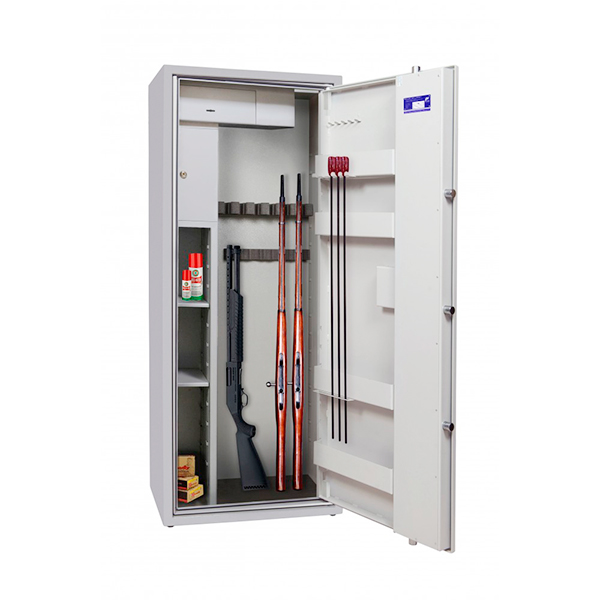 Внутреннее пространство имеет размеры: 1494 мм по высоте, 444 мм по ширине и 293 мм по глубине. Он включает передвижной ложемент под оружие с оптикой и съемный магнитный ложемент, который устанавливается на любую удобную высоту. Есть 3 полки. Их можно легко снять, если будет необходимость хранить объемные предметы. Кроме того, на дверях присутствуют съемные навесные элементы, которые переставляются: карманы для магазинов под патроны и средства по уходу за оружием, держатели для шомполов (2-4 ед.), крючки. Дополнительно в этой модели есть 2 отдельных кассовых отдела (трейзеры), которые можно использовать для хранения патронов. Они закрываются на ключ.