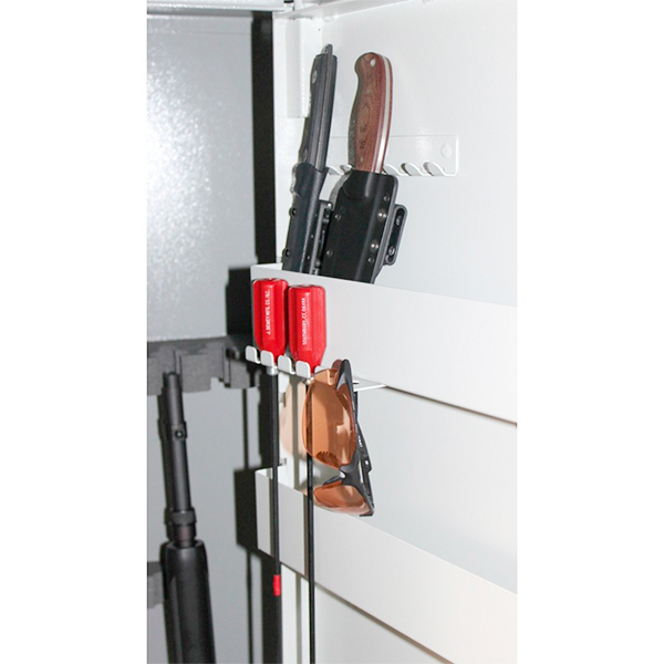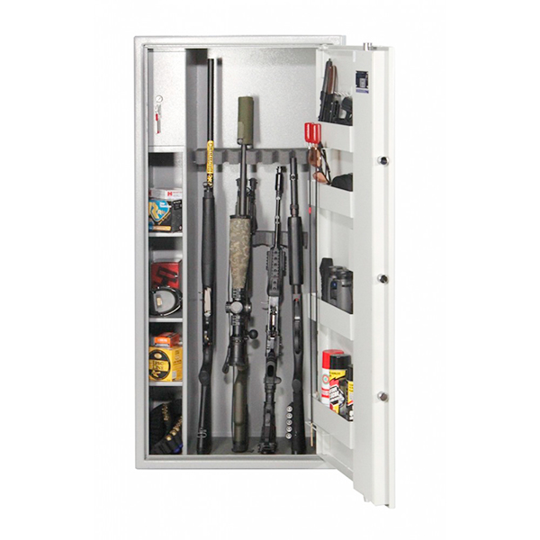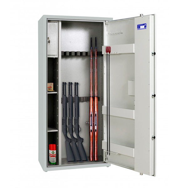Внутреннее пространство имеет размеры: 1394 мм по высоте, 644 мм по ширине и 293 мм по глубине. Он включает передвижной ложемент под оружие с оптикой и съемный магнитный ложемент, который устанавливается на любую удобную высоту. Есть 3 полки. Их можно легко снять, если будет необходимость хранить объемные предметы. Кроме того, на дверях присутствуют съемные навесные элементы, которые переставляются: карманы для магазинов под патроны и средства по уходу за оружием, держатели для шомполов (2-4 ед.), крючки. Дополнительно в этой модели есть отдельный кассовый отдел (трейзер), яки можно использовать для хранения патронов. Он закрывается на ключ.