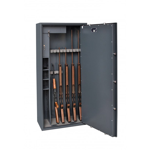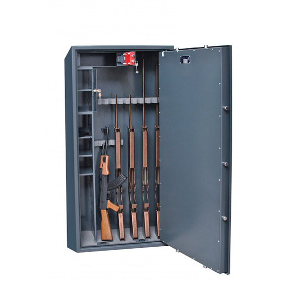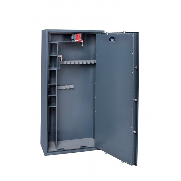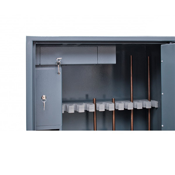 Внутреннее пространство имеет размеры: 1450 мм по высоте, 710 мм по ширине и 293 мм по глубине. Он включает в себя ложемент под оружие. Слева есть 3 полки для удобного хранения негабаритных вещей. Дополнительно в этой модели есть 2 отдельных кассовых отдела (трейзеры), которые можно использовать для хранения патронов. Они закрываются на ключ.