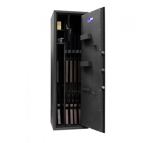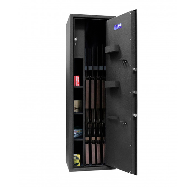 Внутреннее место имеет размеры: 1397 мм по высоте, 417 мм по ширине и 310 мм по глубине. Он включает в себя передвижной магнитный ложемент под оружие. Есть 3 полки. Их можно легко снять, если необходимо хранить объемные предметы. Кроме того, на дверях присутствуют навесные элементы: карманы для магазинов под патроны и средства по уходу за оружием, держатели и фиксаторы под шомполы, монтажная рейка. Дополнительно у этой модели есть отдельный кассовый отдел (трейзер), который можно использовать для хранения патронов. Он закрывается на ключ.