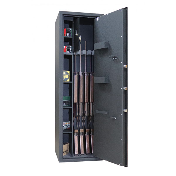 Внутреннее место имеет размеры: 1397 мм по высоте, 417 мм по ширине и 310 мм по глубине. Он включает в себя передвижной магнитный ложемент под оружие. Есть 3 полки. Их можно легко снять, если необходимо хранить объемные предметы. Кроме того, на дверях присутствуют навесные элементы: карманы для магазинов под патроны и средства по уходу за оружием, держатели и фиксаторы под шомполы, монтажная рейка. Дополнительно у этой модели есть отдельный кассовый отдел (трейзер), который можно использовать для хранения патронов. Он закрывается на ключ.
