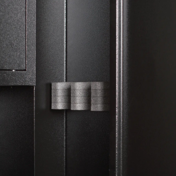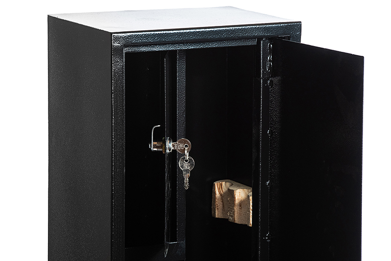 Корпус METALZAVOD ШОЕ-1000 изготовлен из стали. Ее толщина составляет 1,5 мм. Для дополнительной жесткости и надежности конструкция сейфа усилена профильной трубой со стороны дверей. Для защиты от взлома дверь толщиной 2 мм утоплена внутрь. Закрывается ключевым сувальдным замком ПроСам или Титан. Он управляет тремя ригелями диаметром 10 мм. Сейф покрыт специальной порошковой краской черного цвета. Она устойчива к царапинам и коррозии.