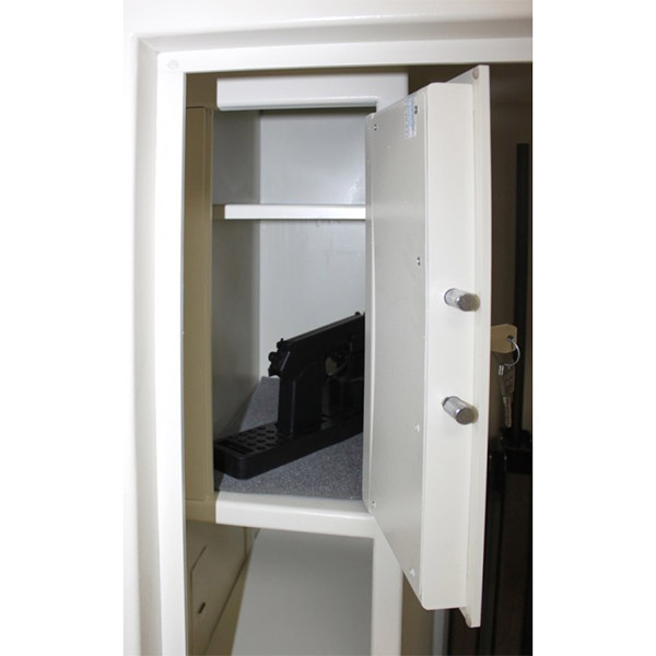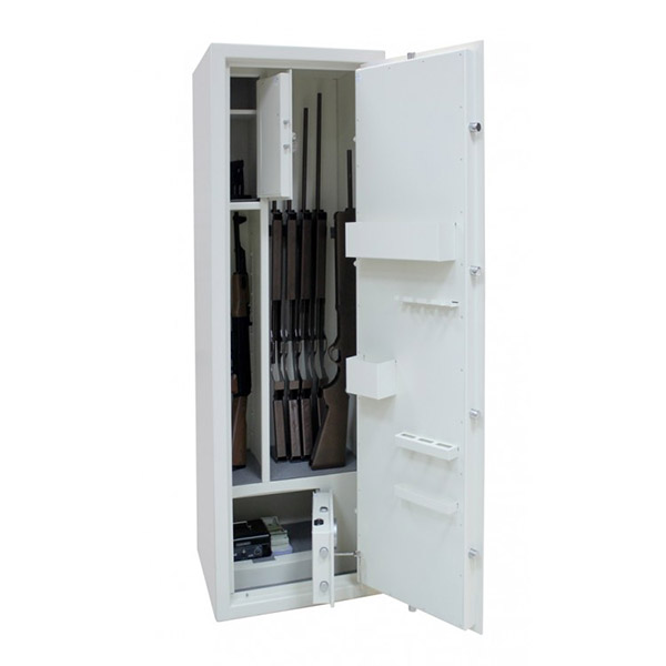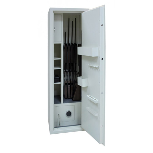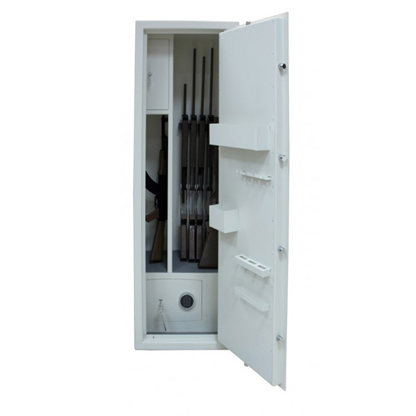 Внутреннее пространство имеет размеры: 1694 мм по высоте, 554 мм по ширине и 449 мм по глубине. Главной фишкой является встроенный внизу внутренний сейф H.30.K.E. Он оборудован ключевым и электронными замками. В основном отделе есть 3 полки, которые можно легко снять, если будет необходимость хранить объемные предметы. В основном отделе присутствует ложемент для 6-ти единиц оружия. Дополнительно сейф оборудован отдельным кассовым отделом (трейзером), который можно закрыть на ключ. Его используют для хранения патронов. Для удобства в нем тоже есть одна полка.