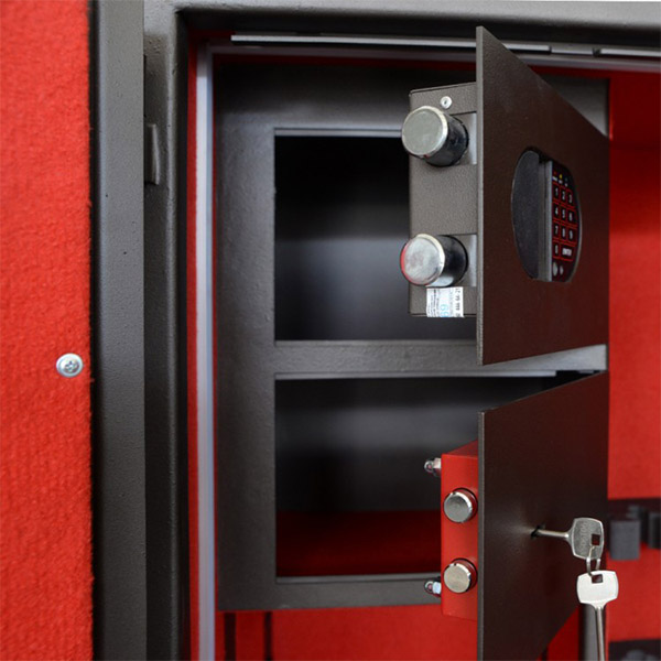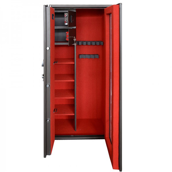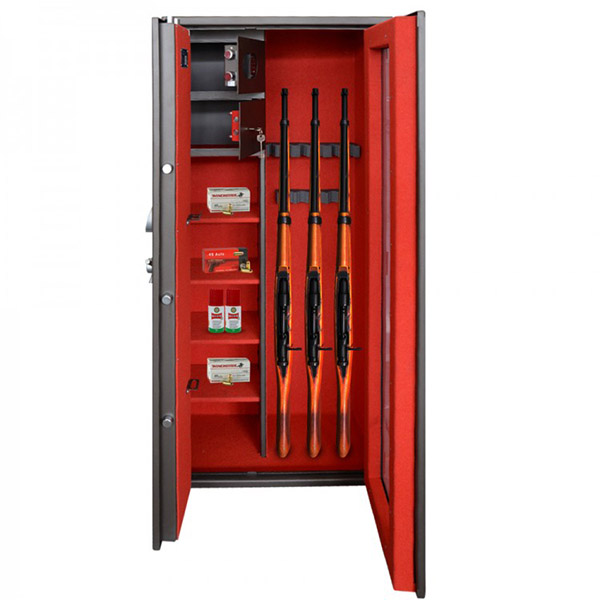 Внутреннее пространство имеет размеры: 1460 мм по высоте, 660 мм по ширине и 293 мм по глубине. Главной фишкой сейфа является изысканный дизайн. В его двери встроено многослойное ударопрочное стекло с классом прочности G0 1143-1. Его толщина составляет 22 мм. Это обеспечивает беспрепятственный обзор оружия, находящегося внутри, не открывая при этом двери. Внутри есть ложемент под оружие с оптикой. Его можно перемещать. Также есть съемный магнитный ложемент, который устанавливается на любую удобную высоту. Сверху находятся 2 отдельных кассовых отдела (трейзеры), которые можно использовать для хранения патронов. Они закрываются на ключ. Объем внутри имеет приятное красное отделки.