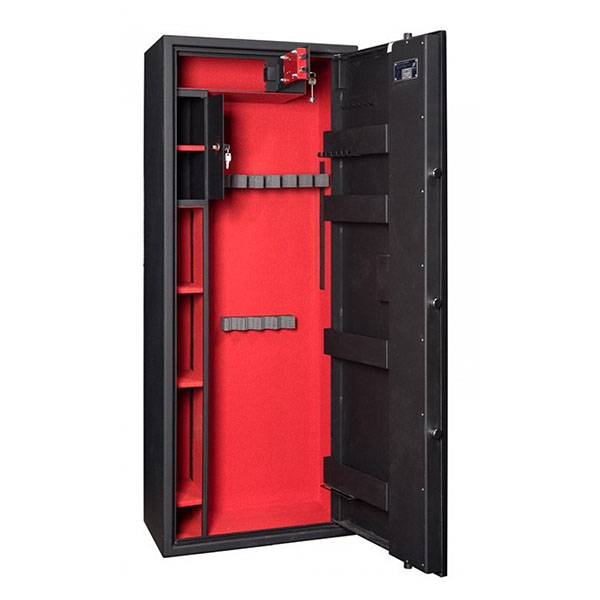 Внутреннее пространство имеет размеры: 1494 мм по высоте, 594 мм по ширине и 293 мм по глубине. Он включает передвижной ложемент под оружие с оптикой и съемный магнитный ложемент, который устанавливается на любую удобную высоту. Есть 3 полки. Их можно легко снять, если будет необходимость хранить объемные предметы. Кроме того, на дверях присутствуют съемные навесные элементы, переставляются: карманы для магазинов под патроны и средства по уходу за оружием, держатели для шомполов (2-4 ед.), крючки. Дополнительно в этой модели есть 2 отдельных кассовых отдела (трейзер), которые можно использовать для хранения патронов. Они закрываются на ключ. Объем внутри имеет приятное красную отделку и подсветку.