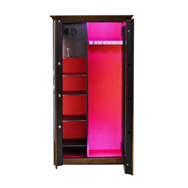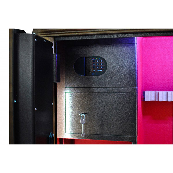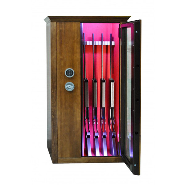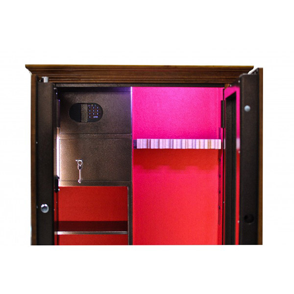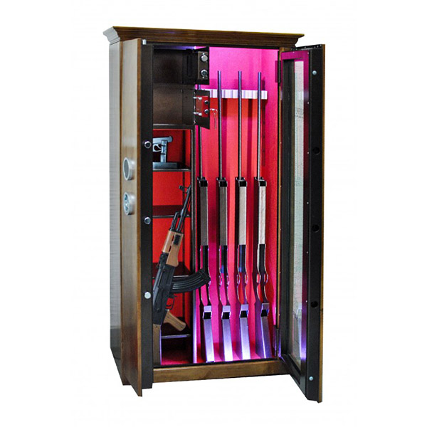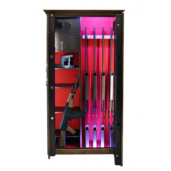 Внутреннее пространство имеет размеры: 1500 мм по высоте, 685 мм по ширине и 300 мм по глубине. Главной фишкой сейфа является изысканный дизайн. Внешне украшен деревом (материал - ольха, цвет - натуральное дерево, покрытие - глянцевый лак), внутренняя отделка - ковролин и подсветка. В его двери встроено многослойное ударопрочное стекло. Его толщина составляет 25 мм. Это обеспечивает беспрепятственный обзор оружия, находящегося внутри, не открывая при этом двери. Внутри есть ложемент под оружие с оптикой, который можно перемещать, и 4 полки. Сверху находятся 2 отдельных кассовых отдела (трейзеры), которые можно использовать для хранения патронов. Один из них закрывается на ключ, другой - электронным кодовым замком.
