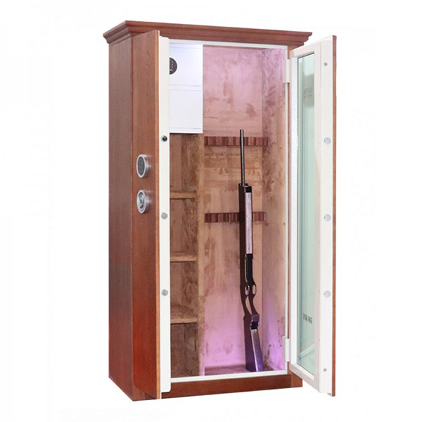 Внутреннее пространство имеет размеры: 1500 мм по высоте, 685 мм по ширине и 300 мм по глубине. Главной фишкой сейфа является изысканный дизайн. Внешне украшен деревом (материал - ясень, цвет - натуральное дерево, покрытие - масло-воск), внутренняя отделка - флок и подсветка. В его двери встроено многослойное ударопрочное стекло. Его толщина составляет 25 мм. Это обеспечивает беспрепятственный обзор оружия, находящегося внутри, не открывая при этом двери. Внутри есть ложемент под оружие с оптикой, который можно перемещать, и 3 полки. Сверху находятся 2 отдельных кассовых отдела (трейзеры), которые можно использовать для хранения патронов. Один из них закрывается на ключ, другой - электронным кодовым замком.