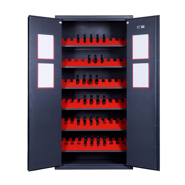 Внутреннее пространство имеет размеры 1994 мм по высоте, 994 мм по ширине и 500 мм по глубине. Главной его фишкой является емкость. Внутри помещается до 90 пистолетов. Для них предусмотрены специальные ложементы на 6 полках.
