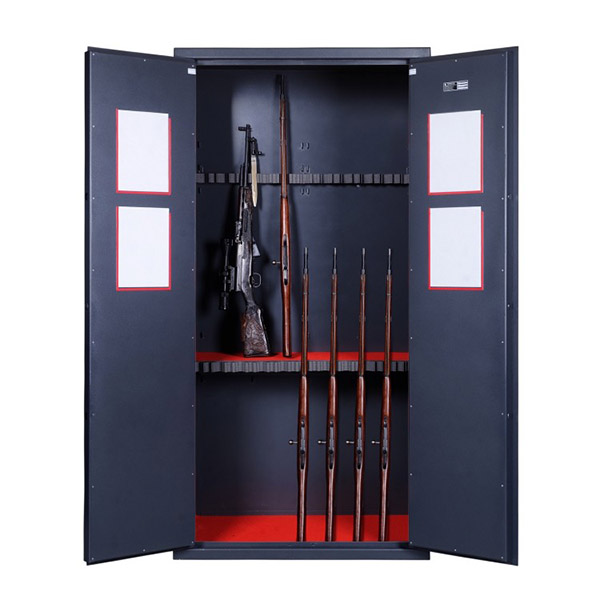 Внутреннее пространство имеет размеры 1994 мм по высоте, 994 мм по ширине и 500 мм по глубине. Главной его фишкой является емкость. Внутри помещается до 20 охотничьих ружей. Шкаф имеет 2 полки, которые помогают разделить общий объем на части.