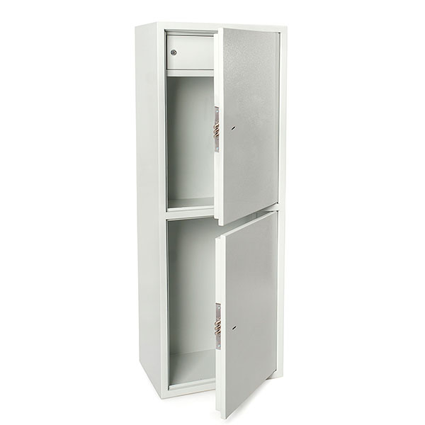Корпус в виде сварной конструкции и двери сейфа изготовлены из стали. Их толщина составляет 1,2 мм. Сейф закрывается ДВУМЯ ключевыми замками отдельно. Для защиты от вандального взлома петли имеют внутреннее исполнение. В сером цвете он отлично дополнит современное помещение и не будет выделяться.