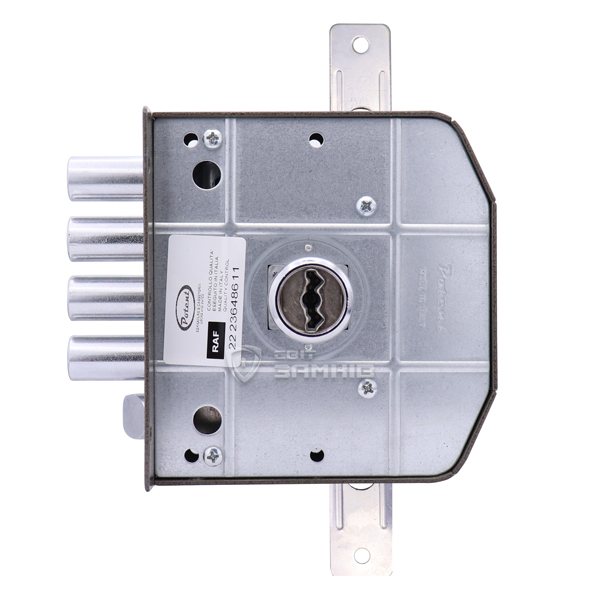 Данная модель предназначена для дверей левого открывания. Снаружи замок управляется сердцевиной с насосным ключом. Она приводит в действие 4 круглых стальных ригеля диаметром 18 мм и дополнительные проушины, к которым можно подсоединить тяги и девиаторы. Благодаря этому закрывание происходит в 3 стороны. Полный выход ригелей составляет 32 мм. При открывании и закрывании двери ключ выталкивается из сердцевины. Такие ключи имеют малые размеры, поэтому их удобно носить в кармане или сумке небольшого размера. Дополнительно также присутствует защелка (язычок). Она управляется засовом также только изнутри помещения. Изнутри замок закрывается поворотом ворота.