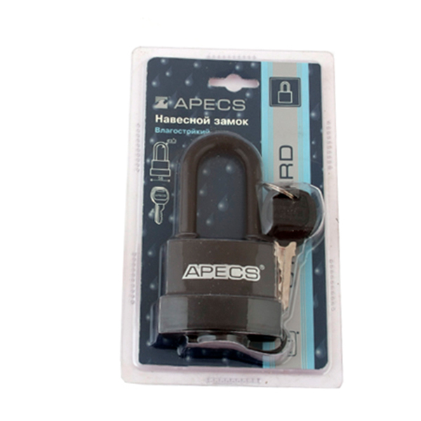 APECS PDR-50 LONG - навесной замок китайского производства. Чугунный корпус в пластиковом чехле защищает от коррозии, влаги и различных погодных условий. Дужка запирается с двух сторон, что повышает защиту от силового взлома. Вокруг дужки также находятся резиновые кольца, которые препятствуют попаданию влаги в замок. У этой модели есть резиновая заглушка, которая не дает попасть пыли и грязи в сердцевину замка. Имеет функция автоматического запирания, в результате нажатия на дужку. Благодаря длинной дужке можно использовать на широко расставленных, или неровных навесах.