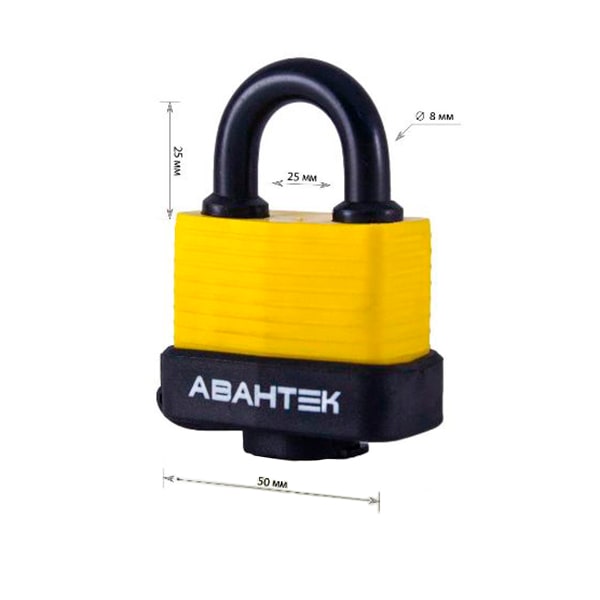 Серия украинских навесных замков АВАНТЕК FL. Этот замок изготовлен из стали. Дополнительно он находится в резиновом чехле, который полностью защищает его от коррозии, влаги, перепада температур и различных погодных условий. Дужка замка изготовлена ​​из закаленной стали. Для повышения надежности дужка дополнительно фиксируется с двух сторон. Вокруг дужки находятся резиновые кольца, которые не дают пыли, грязи и жидкости попасть внутрь замка. Нажатием на дужку замка его можно закрыть без использования ключа. Этот замок с уверенностью можно использовать на улице.