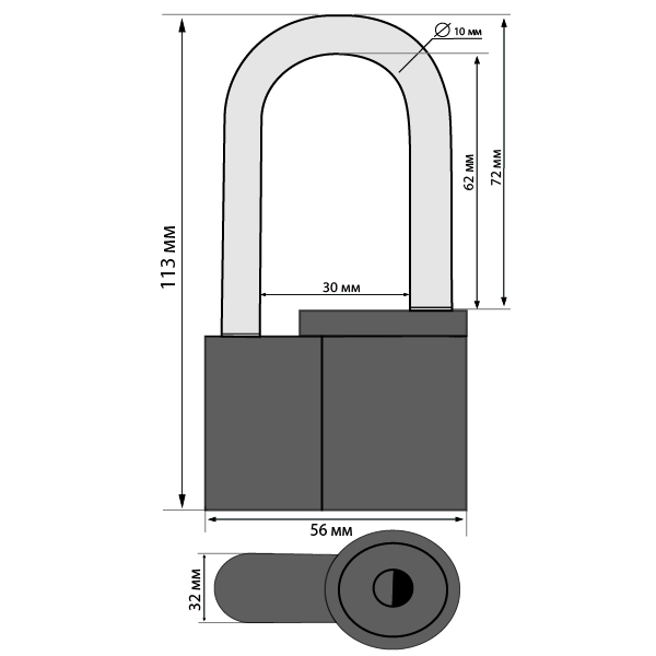 Корпус виготовлений з алюмінієвого сплаву. Це легкий, міцний та довговічний матеріал. Також він стійкий до утворення корозії. Даний замок чудово підійде для використання як всередині приміщення, так і на вулиці. Закривається він ключем. При замиканні ключ вставляється в отвір корпусу і повертається. При цьому дисковий механізм замку переміщується і фіксує дужку. Для відмикання механізма ключ повертається в зворотному напрямку.