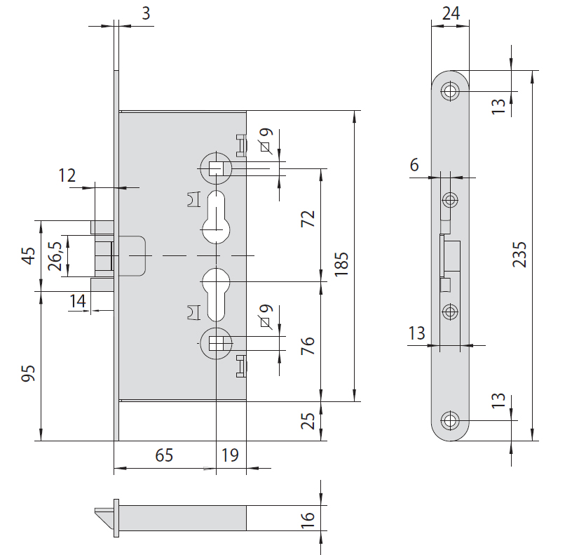 Устанавливается врезным способом монтажа во входные стальные дверные полотна. Управление производится ручкой и сердцевиной. Язычок управляется сердцевиной и ручкой, а вот ригели только сердцевиной стандарта EURO DIN. В открывшемся состоянии замок отпирается нажатием на ручку с любой стороны двери. В закрытом состоянии по обе стороны ручка имеет свободный ход (нажимается, но замок не отпирается). Ключом замок всегда открывается с любой стороны двери. Механизм имеет европейскую сертификацию EN12209:2003, которая гарантирует 200 000 циклов открывания/закрывания.