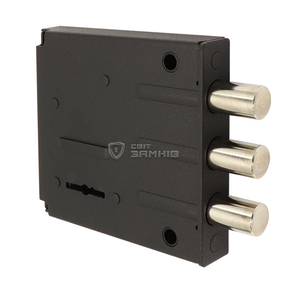 Механизм замка ТМ МЕТТЭМ ЗВ8 812.0.0 - это дополнительный замок врезного типа. Однако из-за отсутствия лицевой планки его можно монтировать методом "вкладывания". Сувальдный механизм закрывания состоит из 6-ти сувальд, которые расположены по обе стороны планки ригеля. Корпус замка изготовлен из стали. Закрывание осуществляется 3-мя стальными ригелями диаметром 14 мм. Их полный выход на 22 мм происходит за 2 полуоборота ключа. Данный замок идеально подходит для установки в качестве дополнительного замка в металлические двери квартир, гаражей и разного рода сейфов и шкафов.