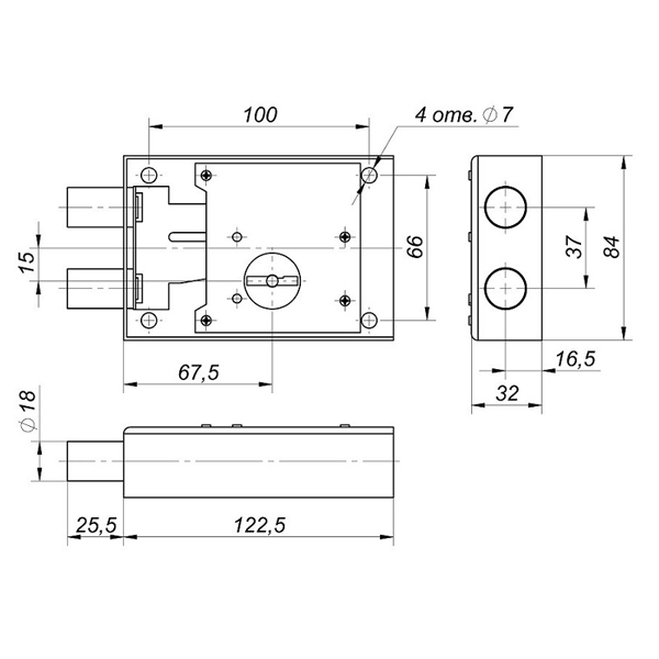 Сувальдный механизм закрывания состоит из 6-ти сувальд. Цвет корпуса – красный. Закрывание осуществляется двумя круглыми ригелями толщиной 18 мм. Их полный выход составляет 25,5 мм. В комплекте 2 ключа. Данная модель замка имеет секретность в более 500 комбинаций.